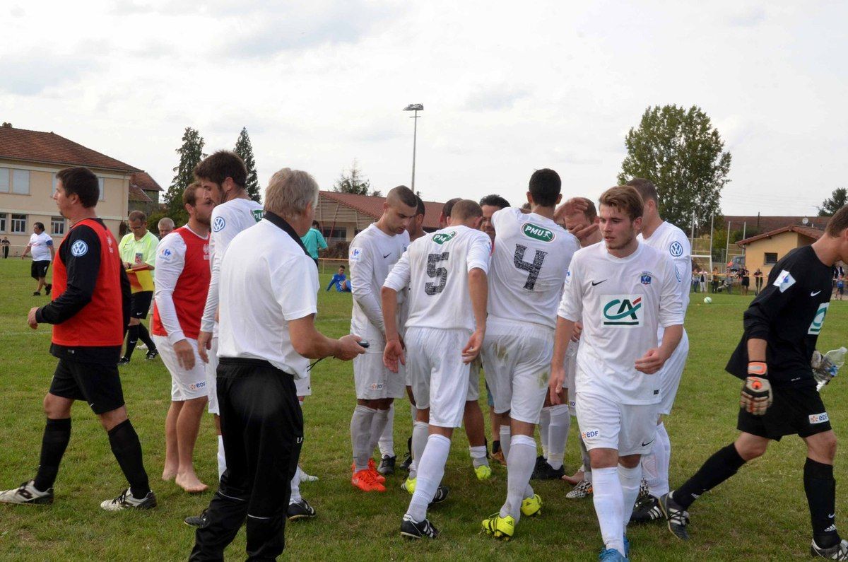 Ce match était engagé entre deux solides formations. Grosse première mi-temps des deux équipes, mais légèrement à notre avantage quand même, en toute objectivité. Je pense que le premier but de Pont-de-Vaux était heureux, il était contre le cours du jeu. Le deuxième but en début de seconde mi-temps nous fait mal, mais on s'est bien repris, on a bien réagi et on a marqué quelques minutes après, puis à la fin du match sur pénalty quand notre numéro 6, Rémy Chauvin a été fauché dans la surface de réparation adverse. Ce pénalty a été salvateur car nous sommes allés aux prolongations puis aux tirs au but que nous avons gagné. J'ai un bon groupe, mais il nous faut encore beaucoup travailler.
